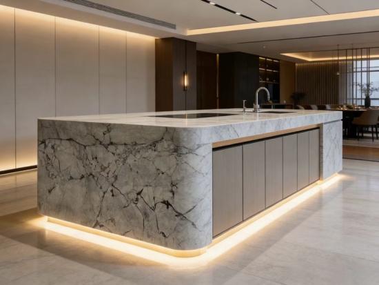 تُظهر هذه المشاريع المميزة نخبة فريقنا قدرات التصنيع أبرز ما يميز هذه المجموعة هو جزيرة حجرية منحنية يتميز هذا الرخام بزوايا مصقولة دائرية سلسة تُبرز تدفق عروقه المتواصلة. وعند دمجه مع إضاءة LED مدمجة، يخلق هيكل رخام دافنشي البلوري الطبيعي مشهدًا ساحرًا. بإضاءة خلفية تأثير في القاعدة، يضيف طبقة من الفخامة الأثيرية إلى أجواء المساء.