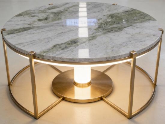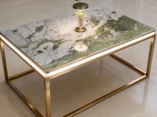 طاولات قهوة مصممة خصيصاً تتميز بألواح فندي الخضراء الطبيعية المدمجة مع إطارات معدنية عالية الجودة وإضاءة مدمجة.