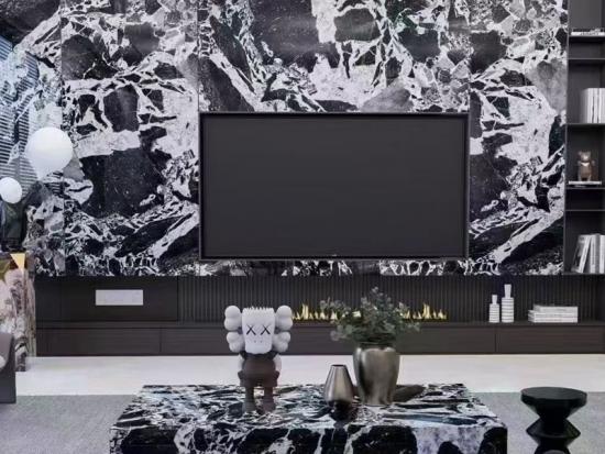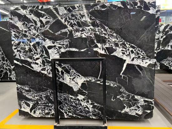 رخام تشاينا جراند أنتيك الفاخر: رخام أسود مذهل مع قطع بيضاء بارزة. مثالي لجدران التلفزيون الفاخرة، وأسطح الزينة، والأثاث المصمم حسب الطلب.