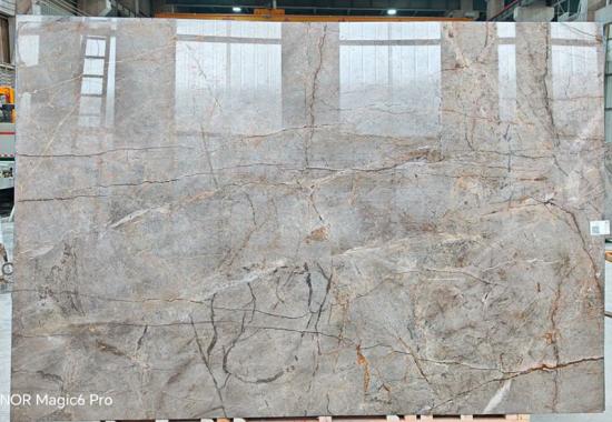 رخام سيلفر روتس يتميز بقاعدة رمادية إسمنتية متطورة متشابكة مع عروق فضية بيضاء وذهبية فاتحة تشبه الجذور، مما يوفر فخامة هادئة مستوحاة من فلسفة وابي سابي للمساحات الراقية